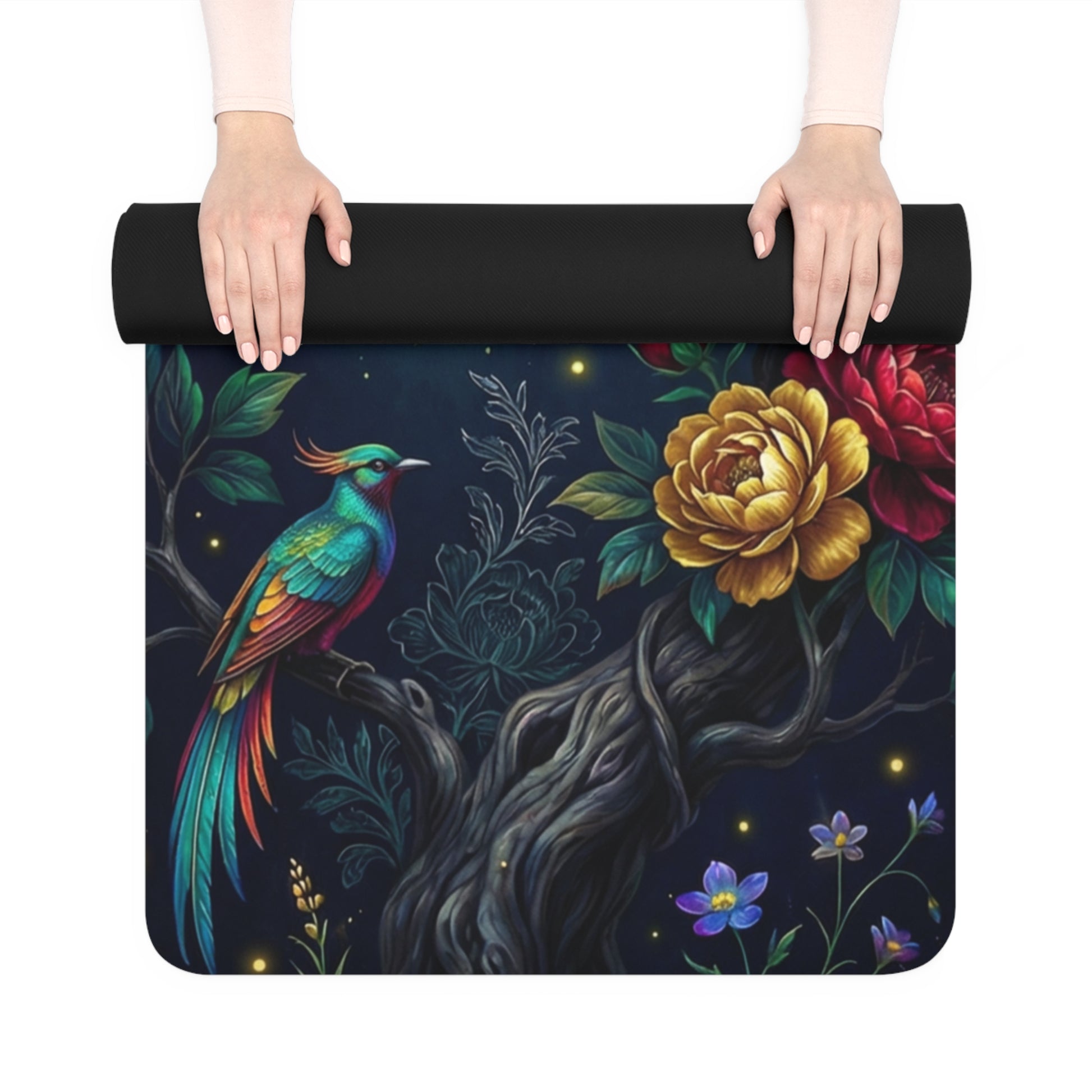 Sink into a quiet practice with a mat that feels like a secret garden beneath your palms. Deep, jewel-toned florals and exotic birds spiral across the microfiber suede surface, creating a calm, focused space that invites slow breaths and attentive movement. The thin, light profile keeps you connected to the floor while a natural rubber base and anti-slip backing hold each pose steady. Roll it up with the included black polyester strap and take the artwork with you to studio class, a sunrise stretch on the balcony, or a mindful session at home. Keep it out of direct sun to maintain those luminous colors.